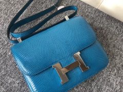 Hermes爱马仕Constance空姐包 24cm Lizard蜥蜴皮 7Q希腊蓝 银扣 单肩包