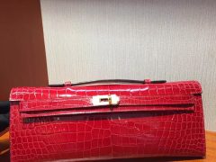 Hermes Kellycut 31cm 宴会手拿包 亮面倒V 野生湾鳄 F5勃艮第酒红 银扣