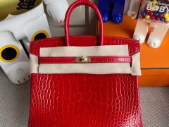 英国爱马仕铂金包价格图片及价格 Britain Hermes Birkin 25cm 亮面倒V 澳洲湾鳄 CC95 Braise 法拉利红 Shiny Porosus Crocodile 顶级工艺 全手工缝制蜜蜡线缝制 金扣 Have In Stock