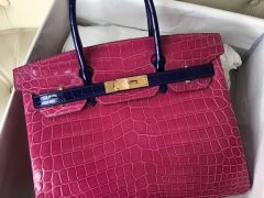 爱马仕铂金包包 Hermes Birkin 25cm Bag 7Q希腊蓝 7W伊兹密尔蓝 亮面两点尼罗鳄鱼 原厂御用亮面鳄鱼皮Shiny Crocodile 金扣 全手工蜜蜡线缝制