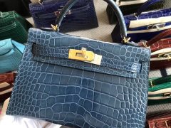 爱马仕凯莉迷你二代鳄鱼皮 皮质 Hermes Kelly mini 2代 CK76深海蓝 Blue indigo 亮面美洲鳄 Shiny alligator crocodile 金扣 全手工蜜蜡线缝