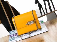 Hermes Verrou插销包 尺寸有中号、小号,还有手拿款~翻盖的设计,小巧便捷,插销设计的包扣是整个包的亮点之处,个性十足。相比较Birkin、Kelly的庄重感,Hermes Verrou就显得年轻许多啦。
