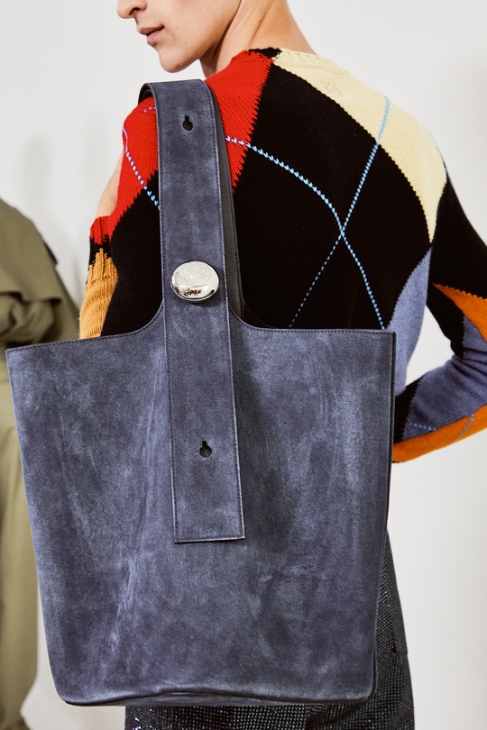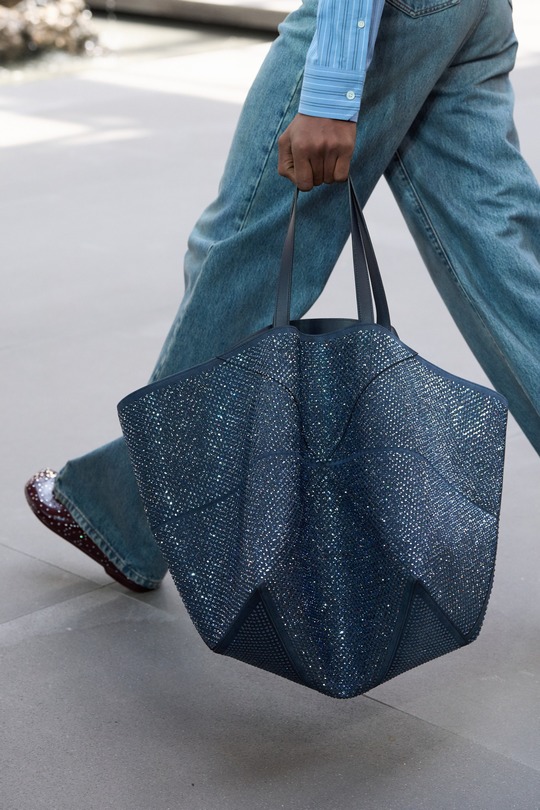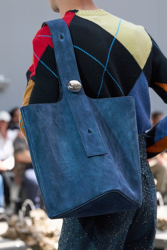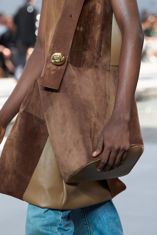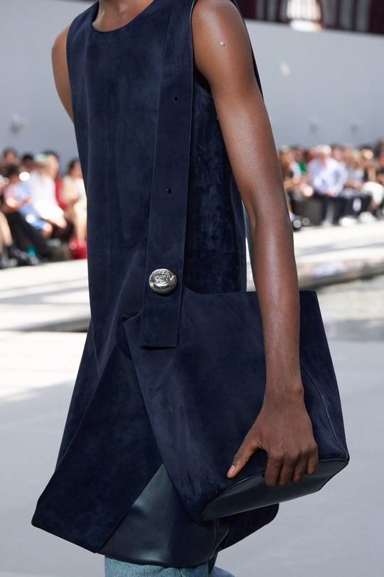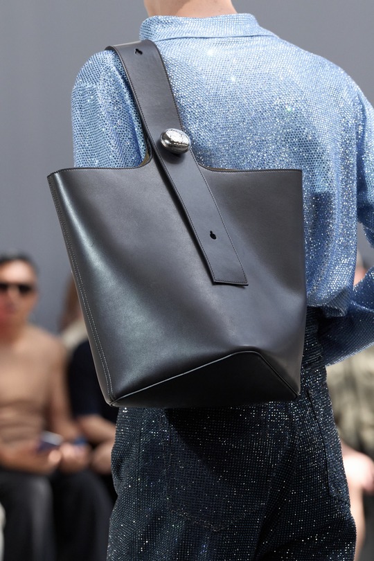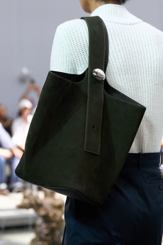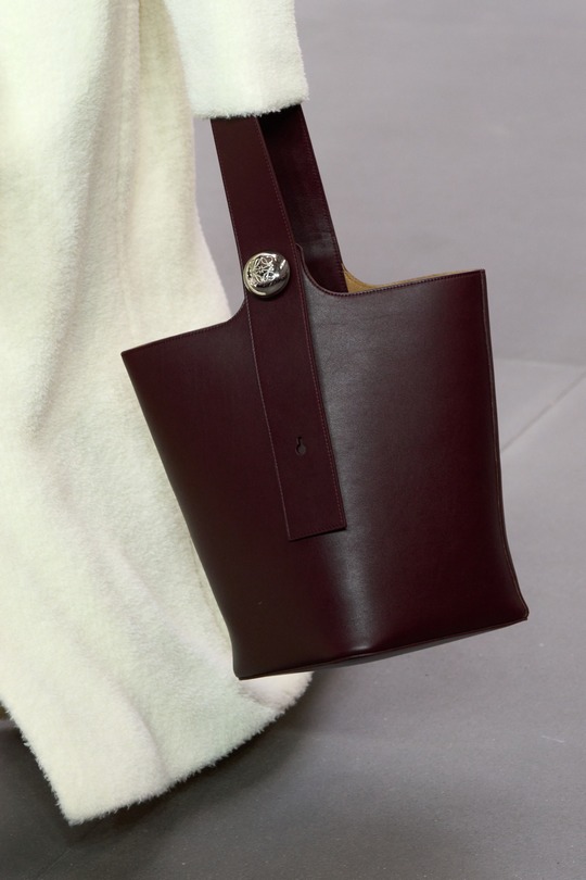本場時裝秀出鏡率最高的是全新推出的 Pebble 水桶包,以極簡寬敞的水桶廓形搭配扁平包口剪裁呈現,最引人注意的是壹枚調節肩帶長度的鵝卵石釘扣設計——抛光處理弧面上刻以 Anagram 徽標圖案。手袋可選光澤小牛皮或溫潤的絨面皮革,大地色系和灰藍色調顯得內斂克制。