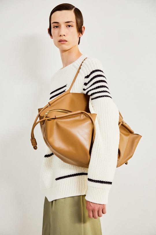 男士 Paseo 包袋采用大尺寸廓形亮相,可夾于手臂下顯得率性而摩登。Paseo 手袋延續修長的流線型外觀,整體造型如同壹只餃子,包身兩側飾帶的繩結元素成爲點睛。
