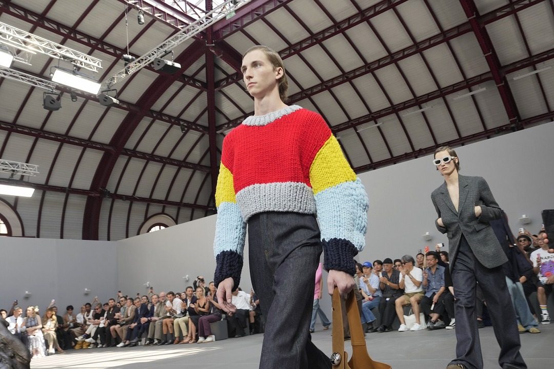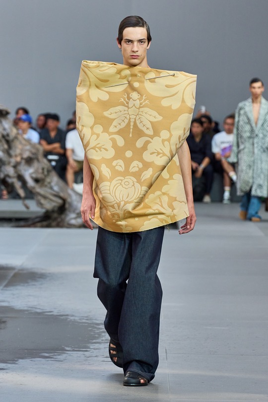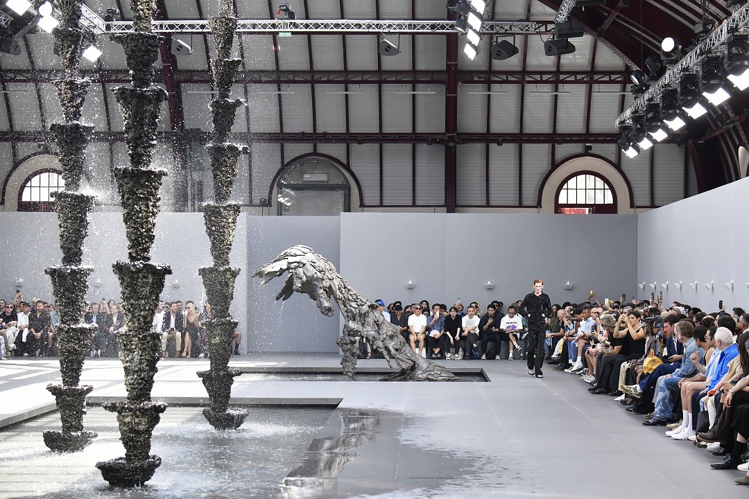 本季男裝秀場選址于法國共和國衛隊馬術競技場(La Garde Republicaine),現場布置美國藝術家 Lynda Benglis 的3件大型噴泉裝置《波動漸強》、《繁盛、琥珀色之波、豐饒之位面》和《海洋騎士》,青銅雕塑與湧動的水流營造出獨特觀感。