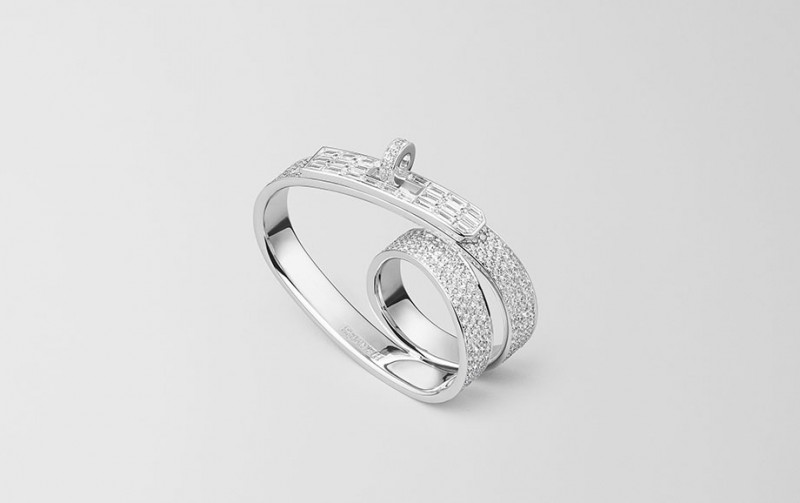 「我對 Kelly 系列珠寶的設計秉持著相同理念,將其原本的輪廓造型重新诠釋或將其徹底顛覆。」愛馬仕珠寶創意總監Pierre Hardy,將 Kelly 包款的經典元素:兩條側帶、旋鈕式包扣,金屬片與四顆小圓釘,玩轉焠煉至另壹境界,「我喜歡創造流動感—交織纏繞的鏈帶,壹分爲二的戒指,隨著行進間擺盪的鑰匙鏈—我喜歡捕捉自然的律動,而非靜止不動。 我喜歡身體蘊藏的力量, 與創作能量互相呼應。」