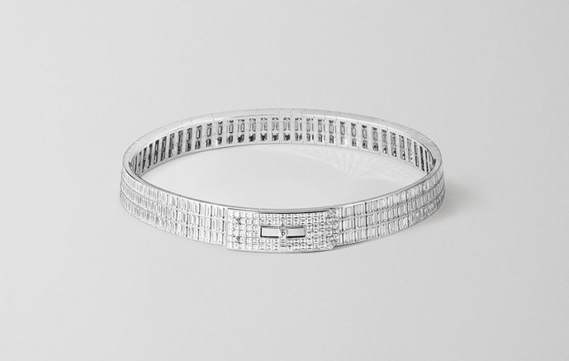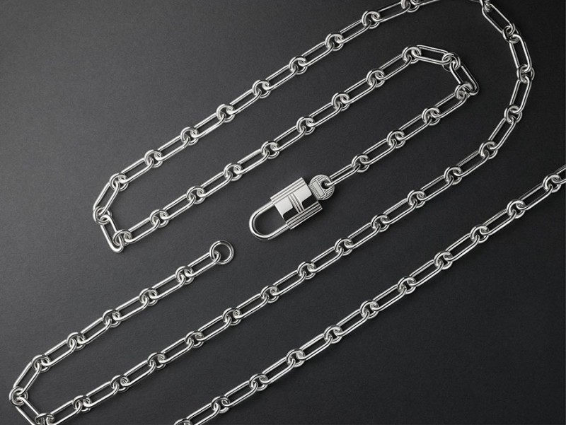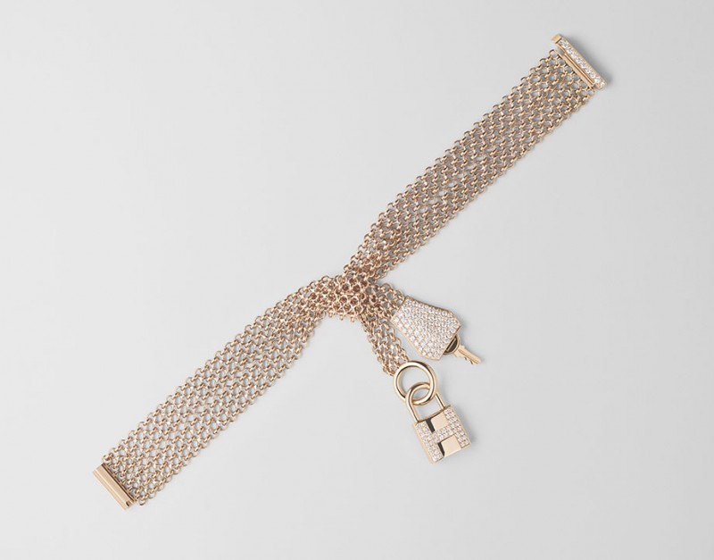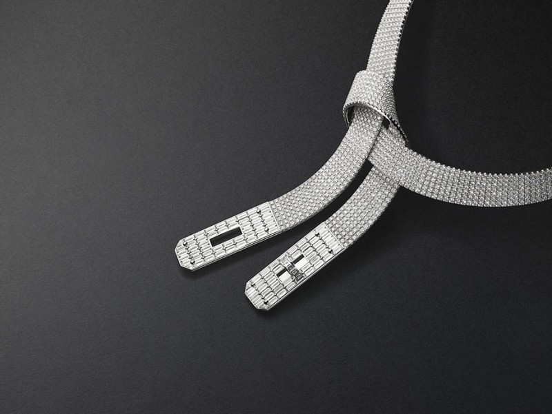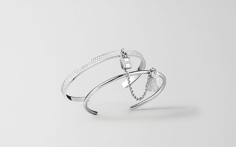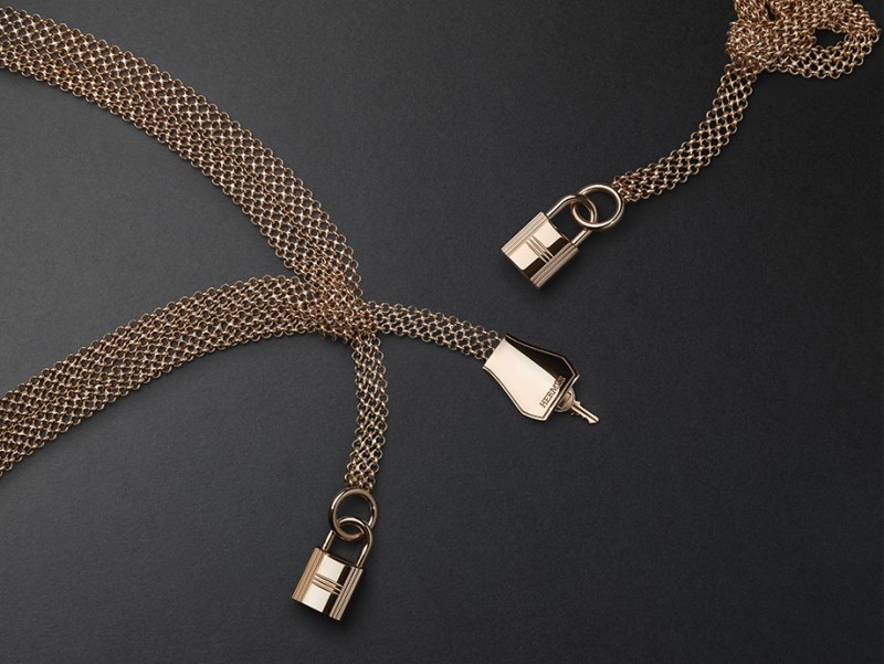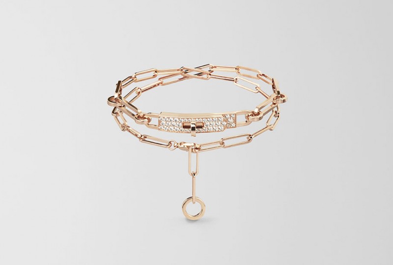 愛馬仕再次展現多麼美麗的叛逆!將極爲標志性的凱莉包成爲妝點頸間、手腕和指間的珠寶,其梯形外觀是優雅別致的化身;永垂不朽的奧祕就藏在簡單元素之中 : 自信挺立的造型、兩條側帶、包扣、鎖頭和鑰匙套 。從實用配件到精巧裝飾,百變型態饒富趣味。是壹種新奇的解構,也是奢華的重組。更是對珠寶的大膽致敬。玫瑰金浪漫如曙光,尖晶石深邃如星夜,白金澄澈如初雪,還有堅實純銀與璀璨美鑽,或爲長方形切割、或有細致浮雕, 或烏黑發亮。鏈帶有多種佩戴方式,單圈、雙圈,或垂掛于鎖骨之間,或流瀉于裸背肌膚,再以鑲鑽鏈扣完美相連。每件作品都體現設 計師 Pierre Hardy 鮮明玩趣的設計宣言。
