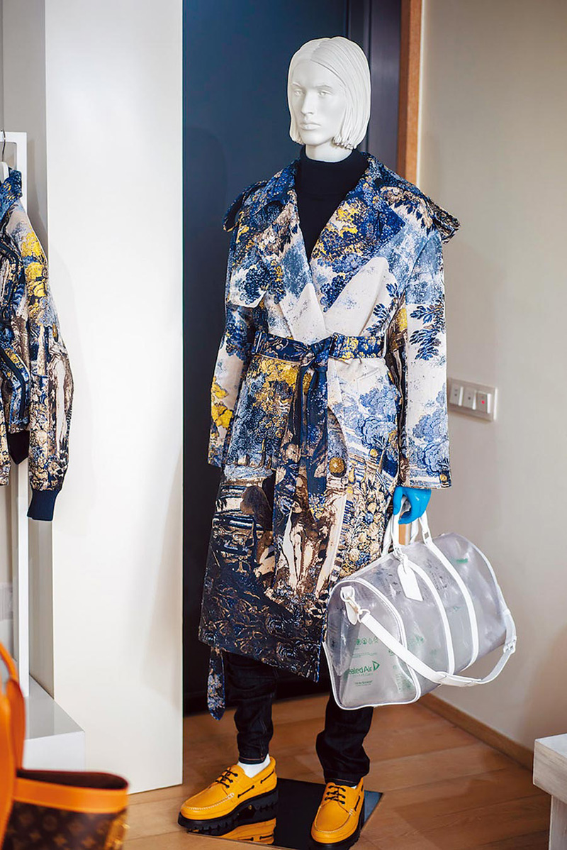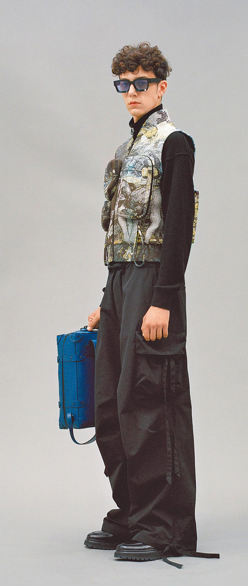 拉菲尔拼贴画作为缇花织品装饰背心、风衣外套或飞行员夹克,上有不可拆卸的手拿包、手机袋,进阶了配件化与夹层化。针织貂皮上衣用不同长度的皮毛打造沙漠迷彩图腾,摸来手感柔软;军用夹克与衣裤上的巴黎木纹、法国家庭常见的波斯地毯图腾,本以为是刺绣其实是针织布料,粗旷印花更能衬托出Virgil Abloh在乎的精致面料。