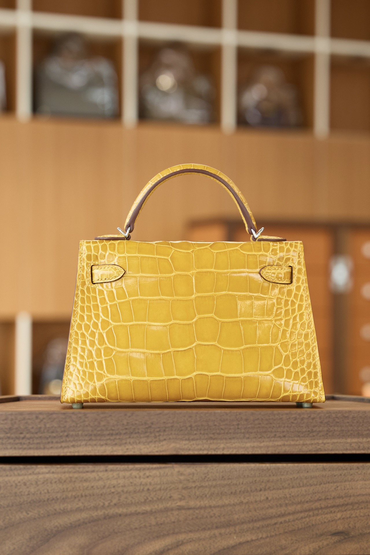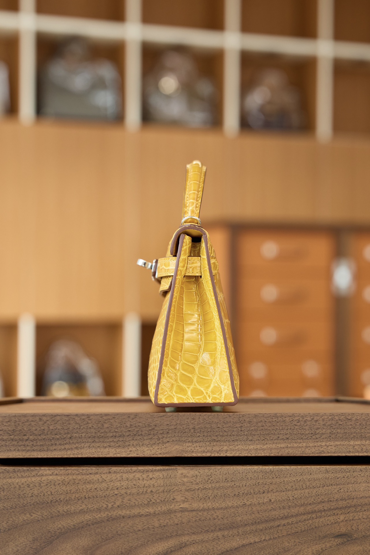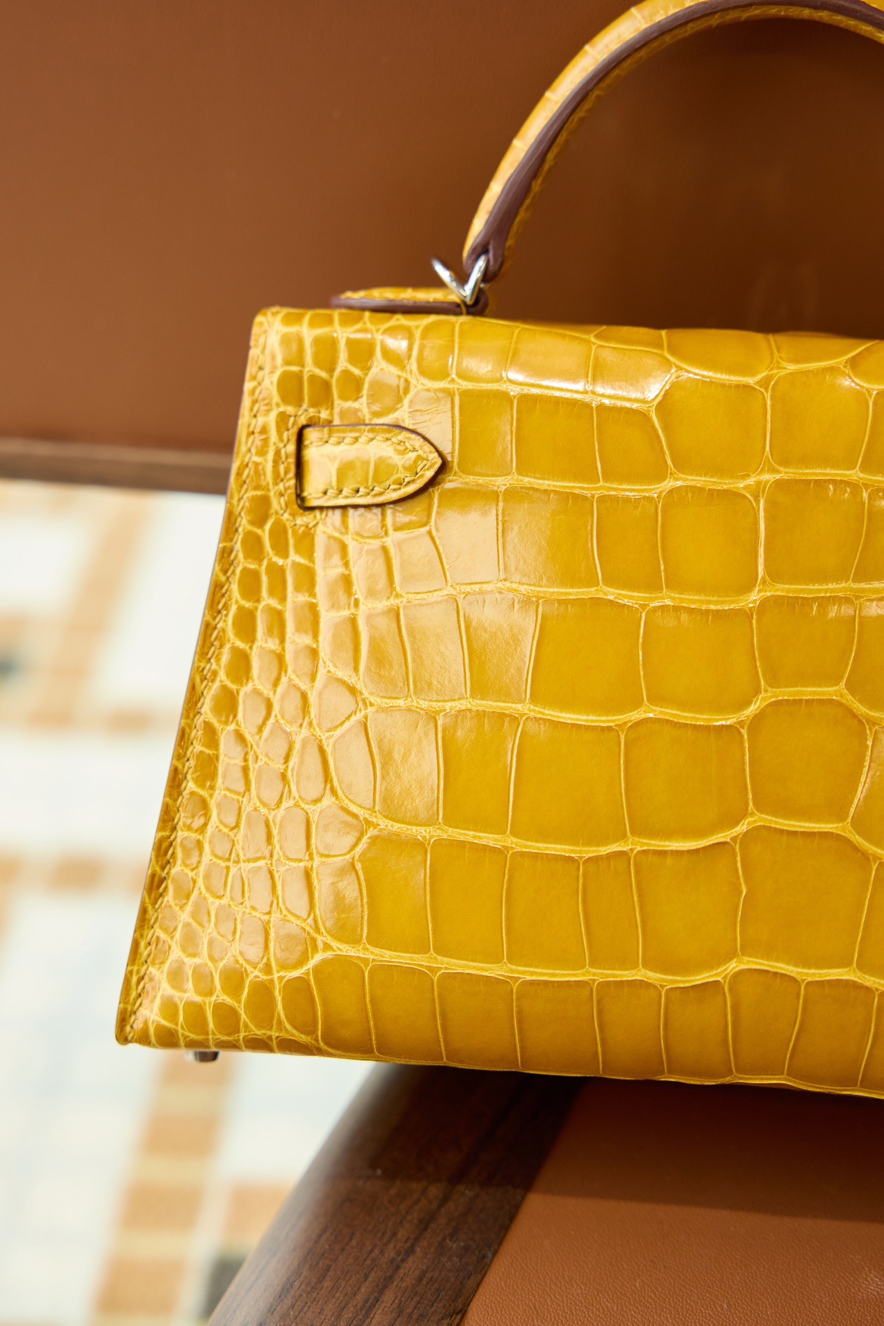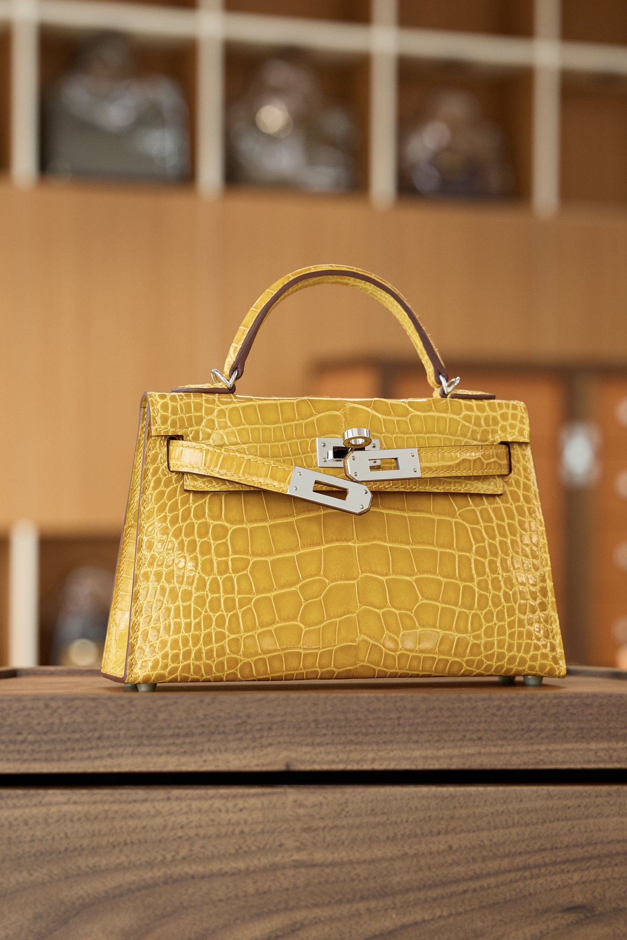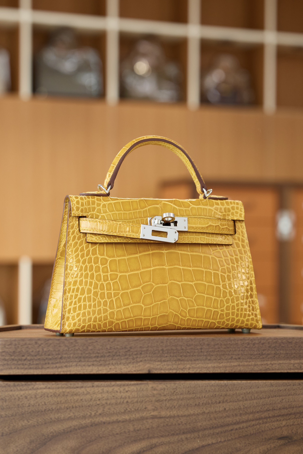 爱马仕 Mini Kelly II 迷你凯莉二代 亮面鳄鱼皮 琥珀黄银扣 高光奢贵琥珀黄亮面鳄鱼皮,精致银扣点缀。