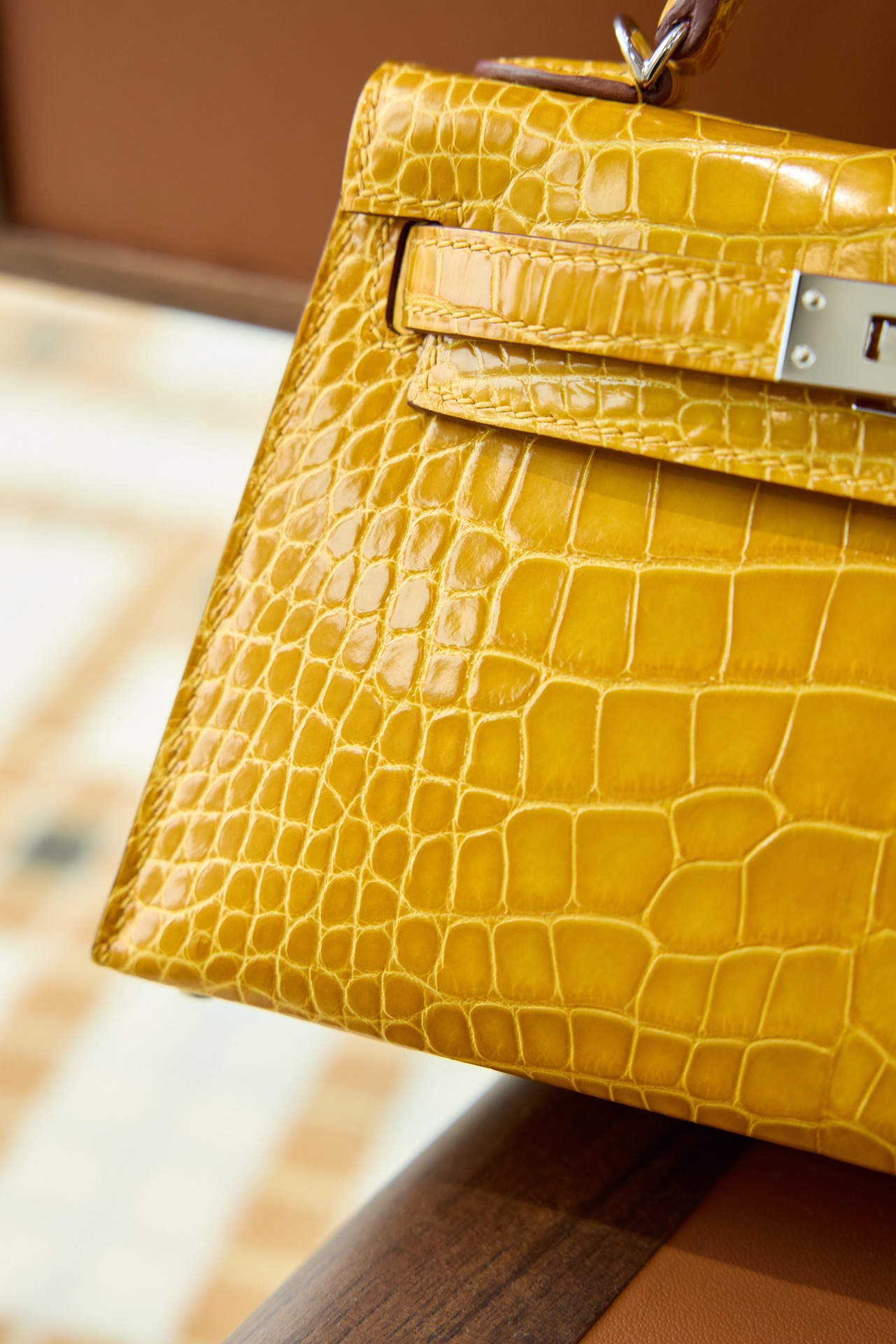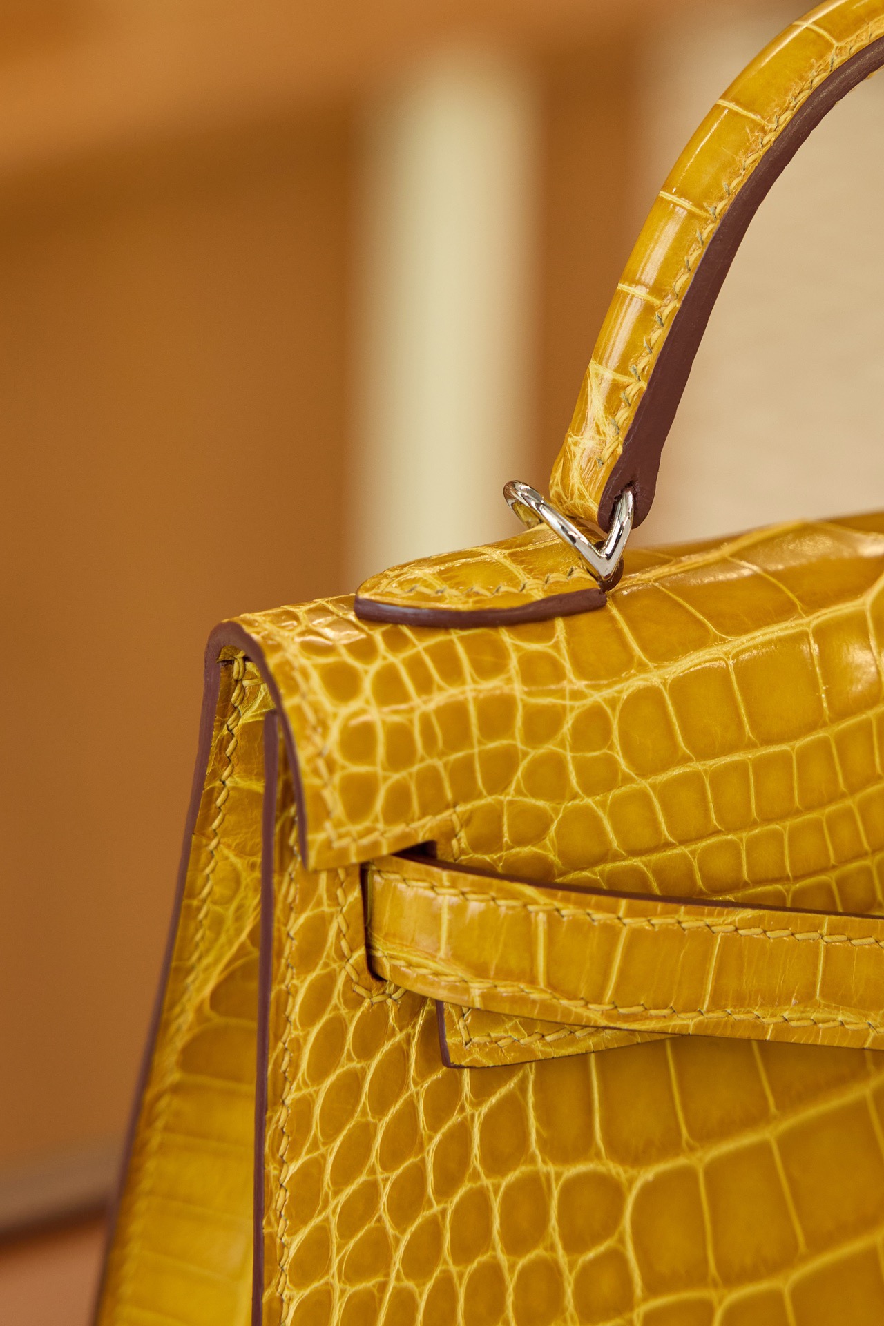 Hermès Mini Kelly II Shiny Alligator Crocodile, Amber Yellow Tone Palladium Silver Hardware Fully handmade premium wax thread saddle stitching
