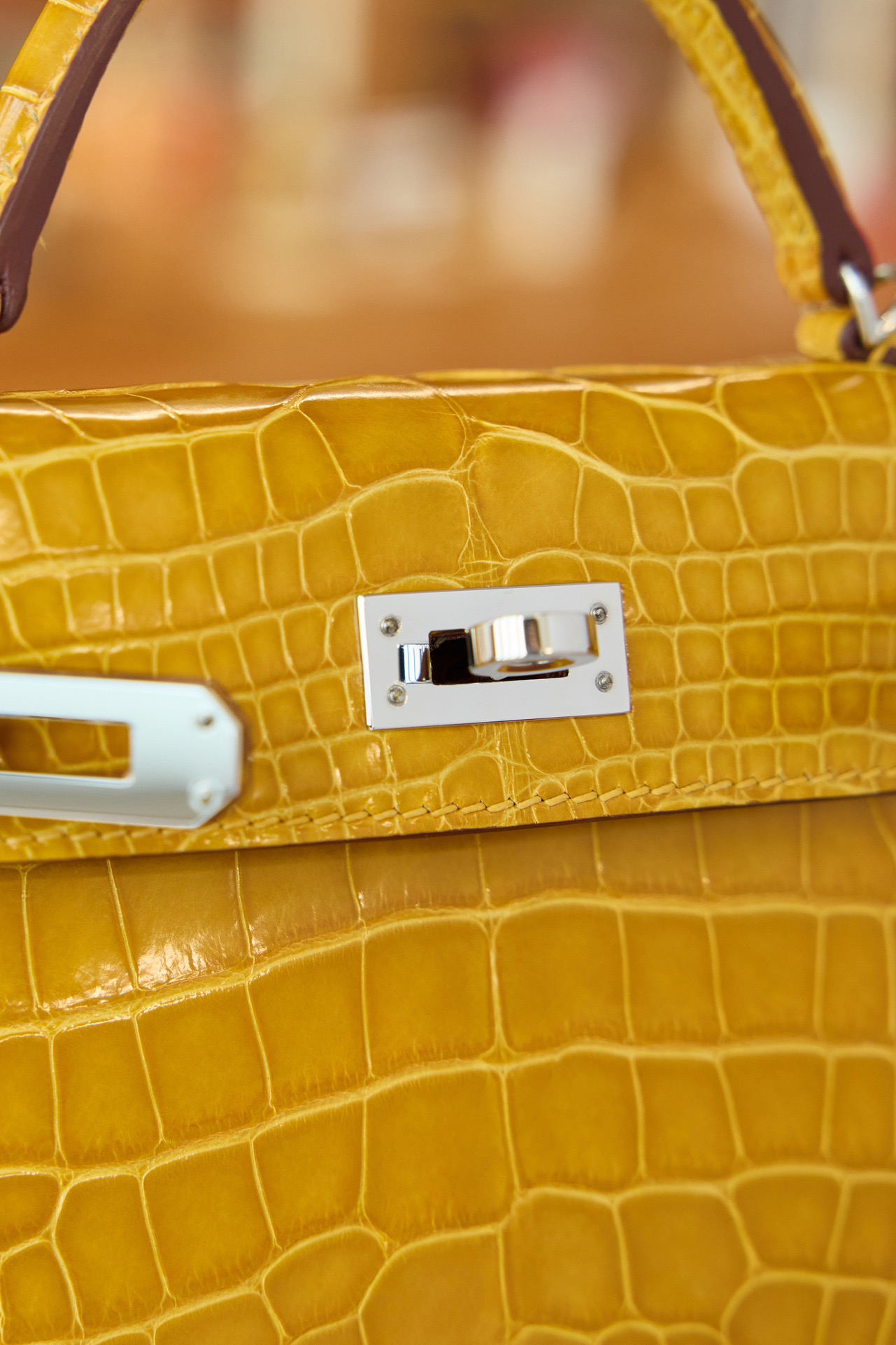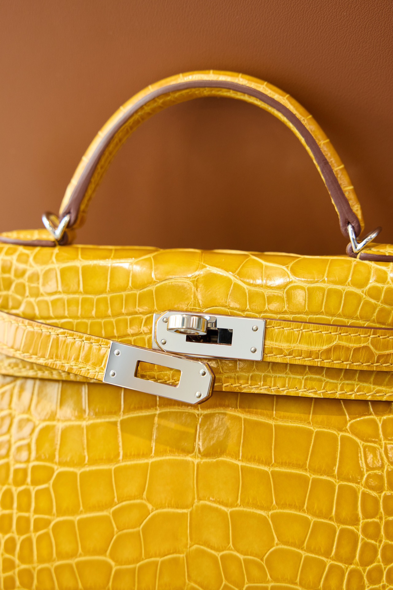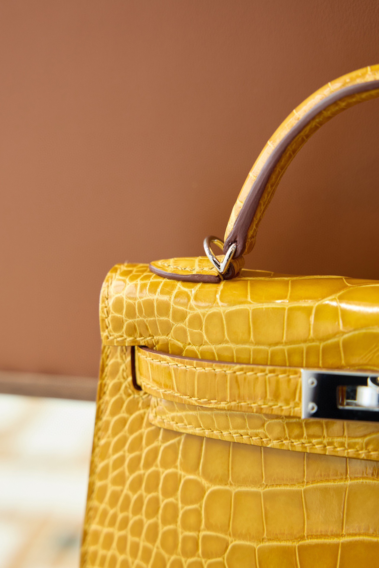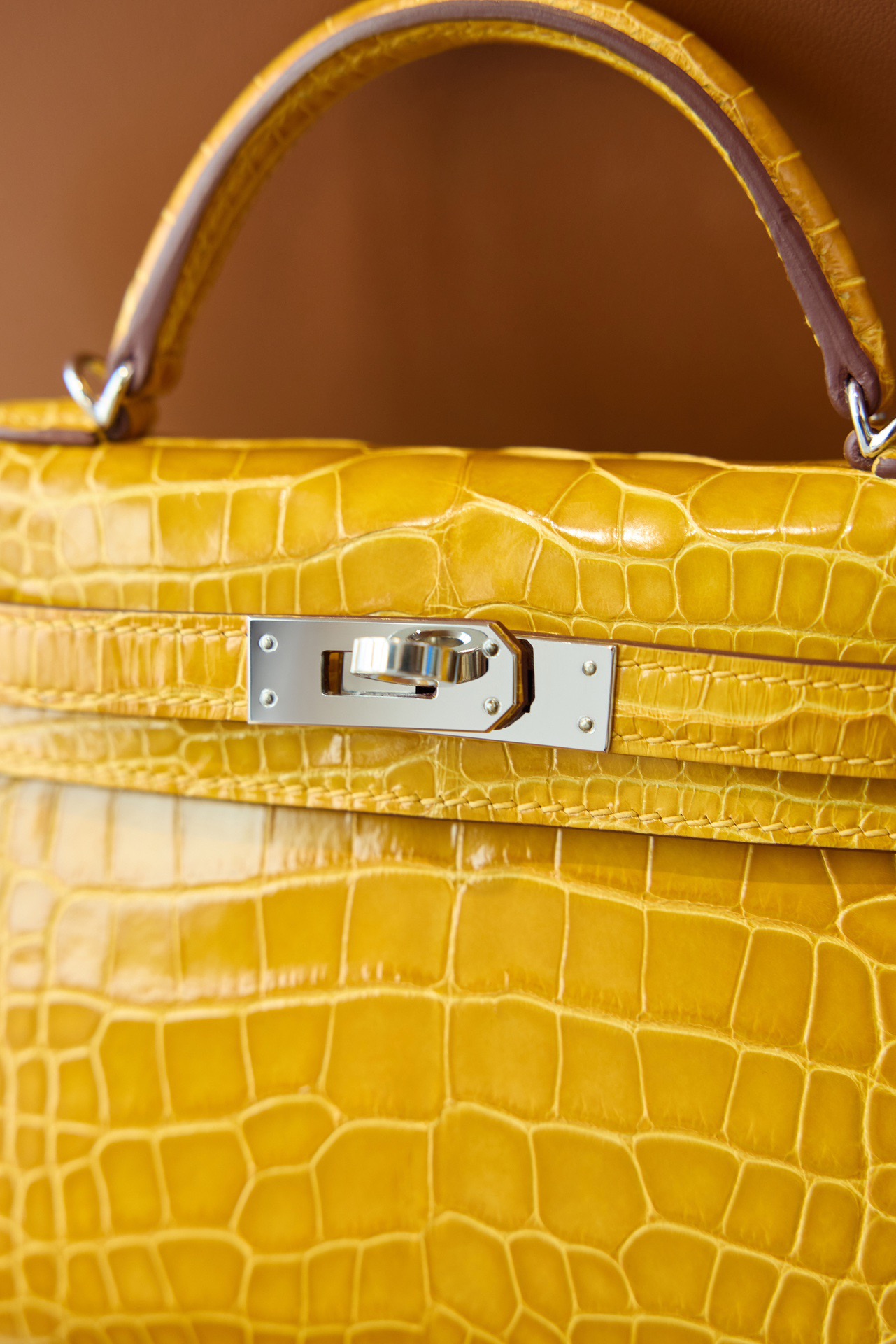 Hermès Mini Kelly II Shiny Alligator Crocodile, Amber Yellow Tone Palladium Silver Hardware Fully handmade premium wax thread saddle stitching
