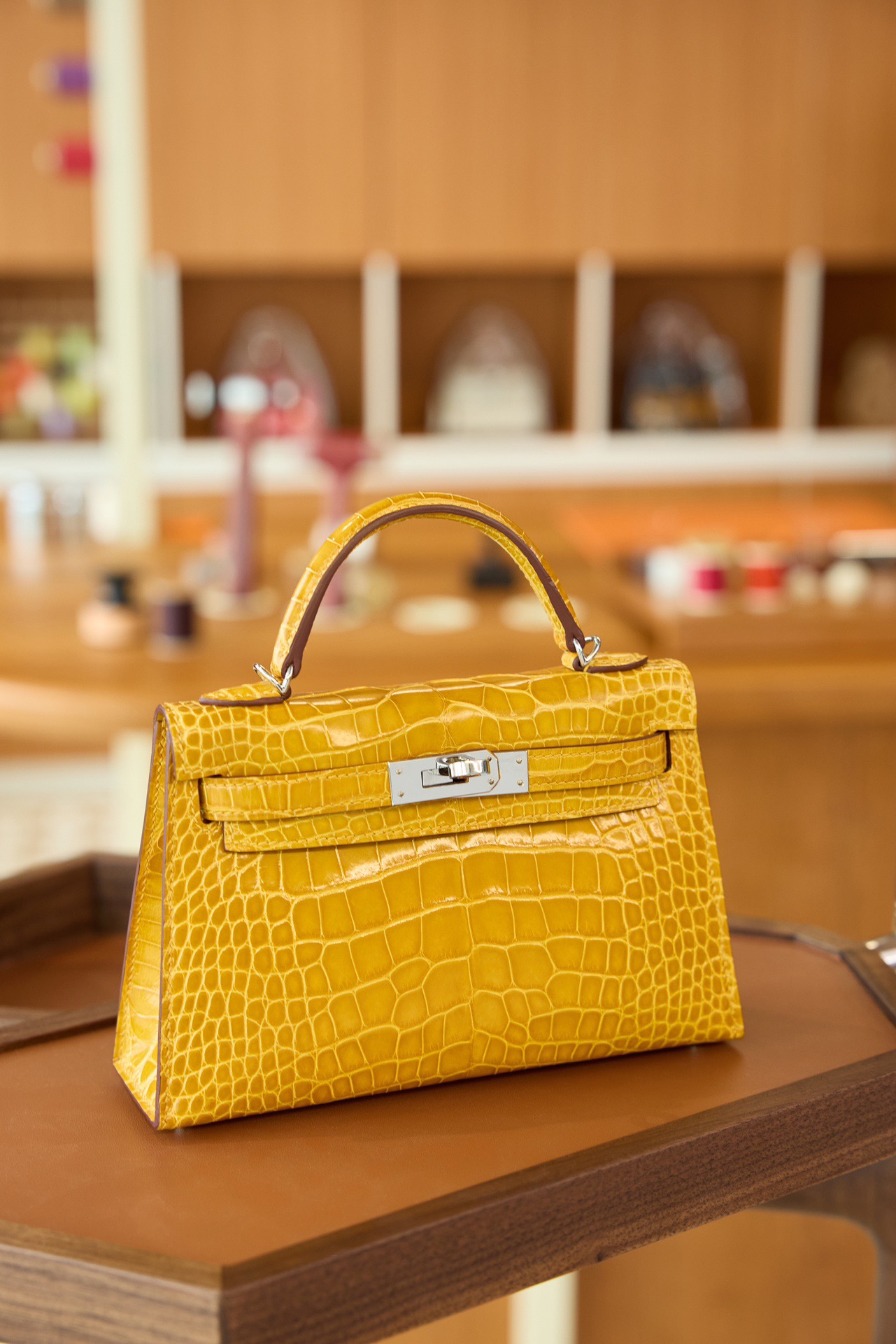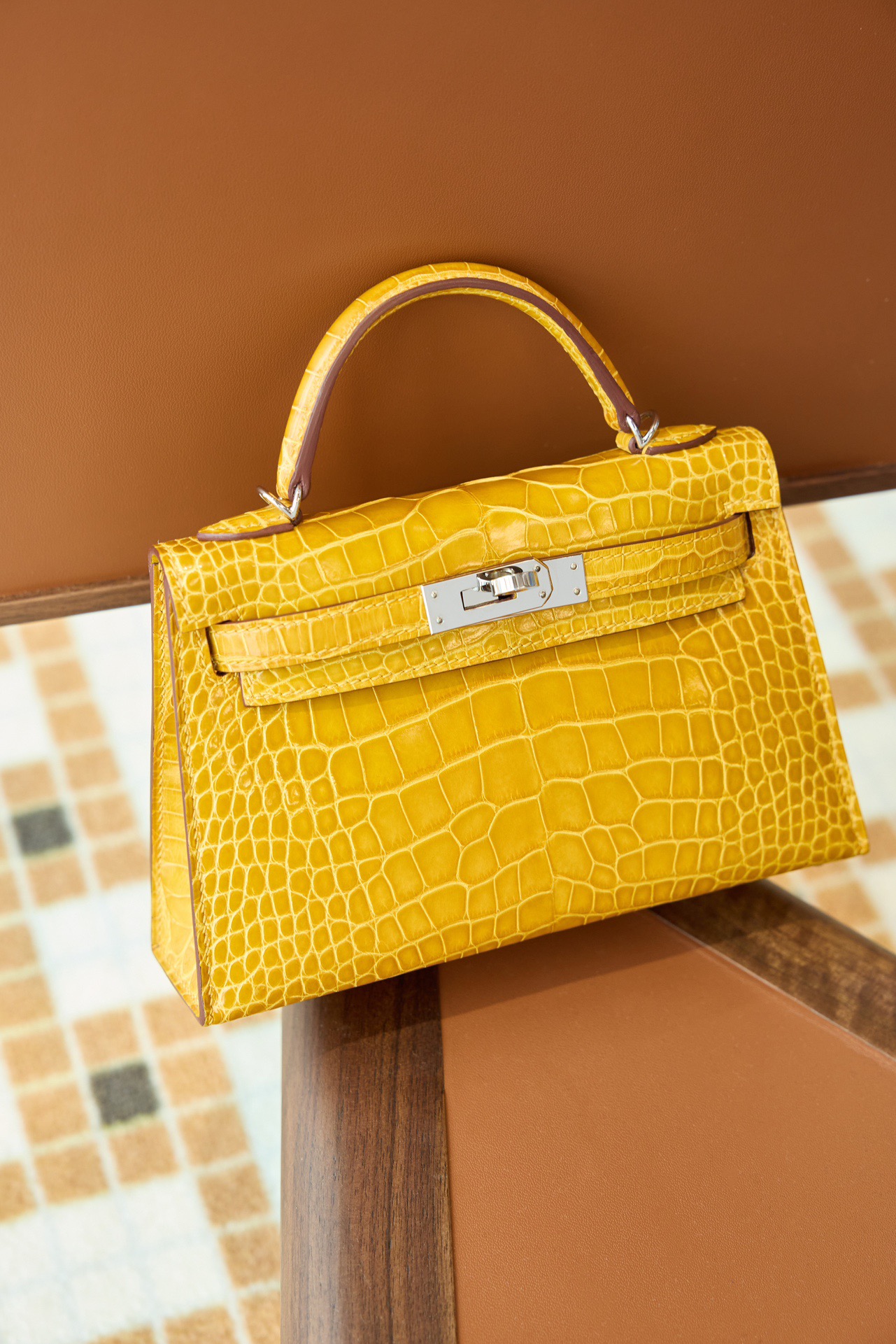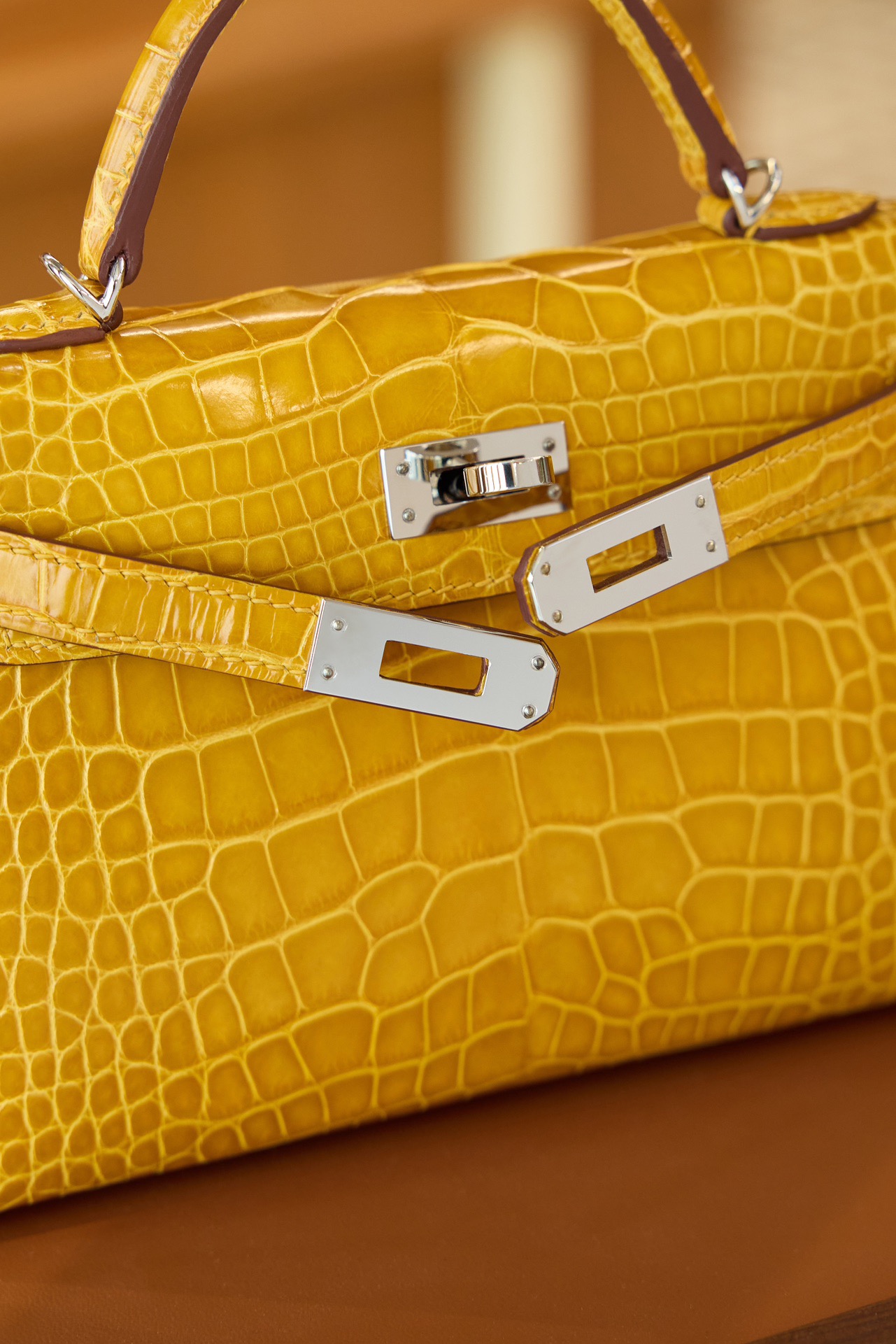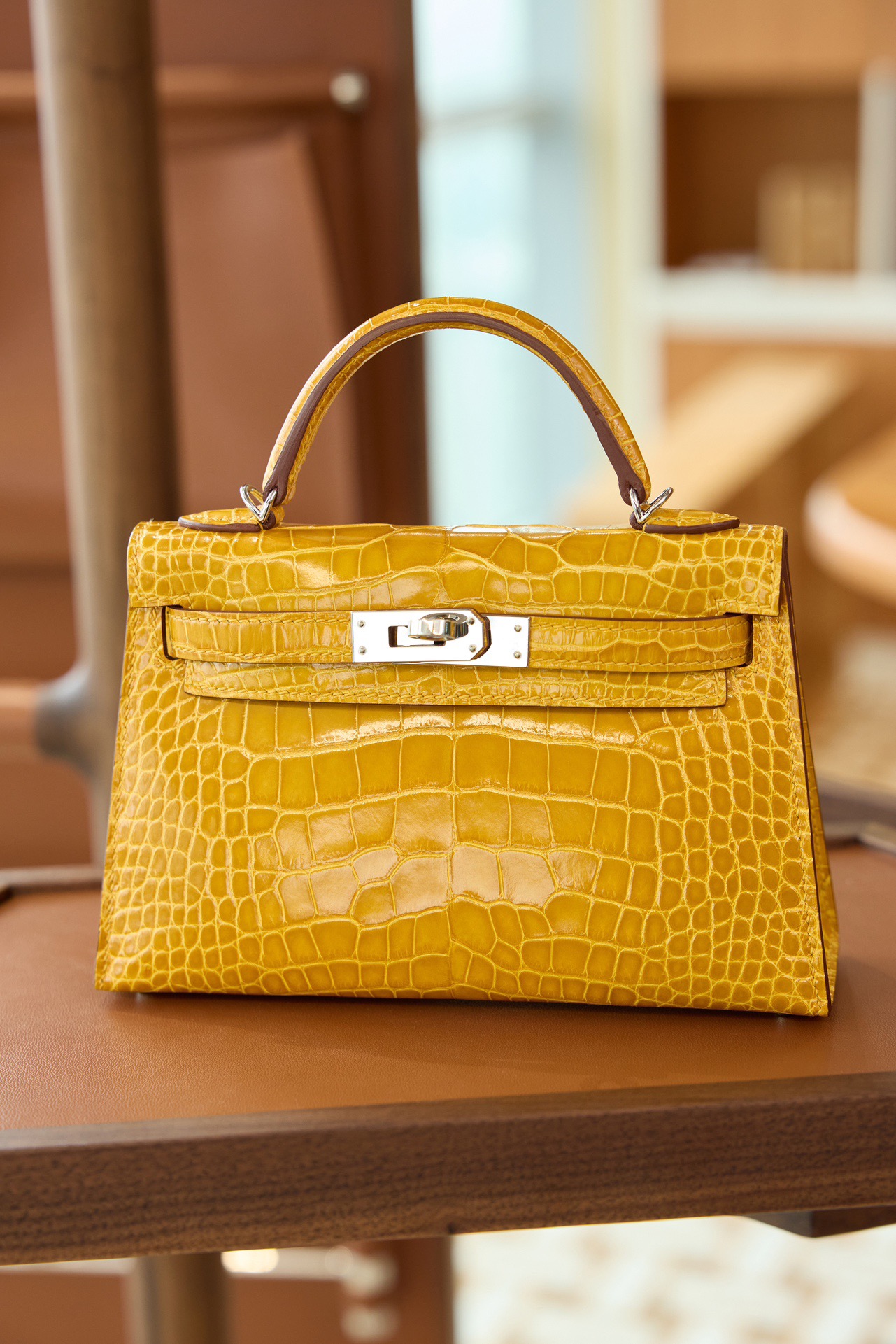 Hermès Mini Kelly II Shiny Alligator Crocodile, Amber Yellow Tone Palladium Silver Hardware Fully handmade premium wax thread saddle stitching