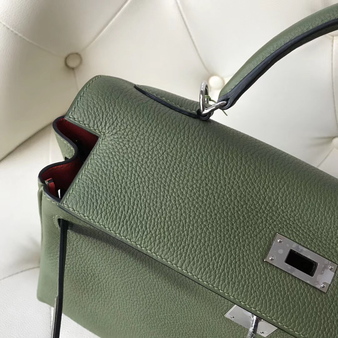 爱马仕凯莉包多少钱 Hermes Kelly Bag 32cm Togo 御用小牛皮 V6丛林绿 内拼色 9T火焰橙 银扣 全手工蜜蜡线缝