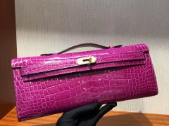 Hermes Kellycut 31cm 宴会手拿包 亮面倒V 野生湾鳄 F5勃艮第酒红 银扣