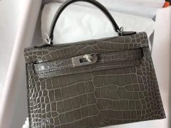 爱马仕迷你凯莉包2代 Hermes mini Kelly 二代 20cm 亮面方块鳄鱼皮革 Shiny alligator crocodile CK89黑色 金银扣金属 全手工蜜蜡线缝。