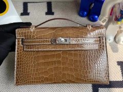 爱马仕迷你凯莉包一代价格 Aomen Hermes Mini Kelly Pochette 22cm 亮面美洲鳄鱼 CK17 Ficelle 淡灰褐色 烟草色 Shiny Alligator Crocodile 全手工缝制 金扣 in stock