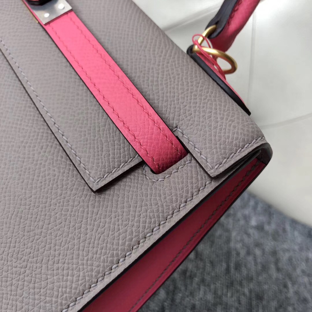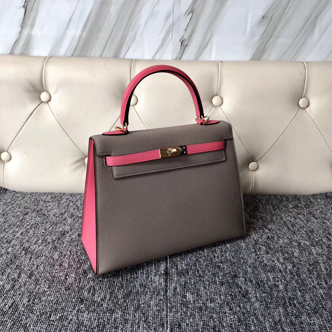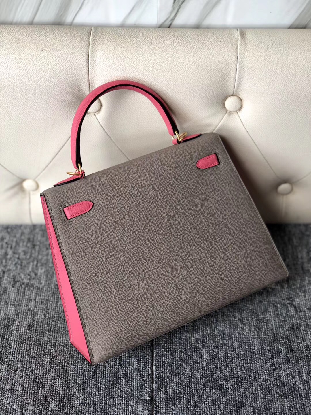 深圳爱马仕包包万象城专卖店 Hermes Kelly 25cm Hss 双拼色 Epsom M8 Griss Asphalte 沥青灰/8W新唇膏粉Rose azalee 拉丝金扣 客定出货