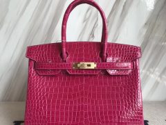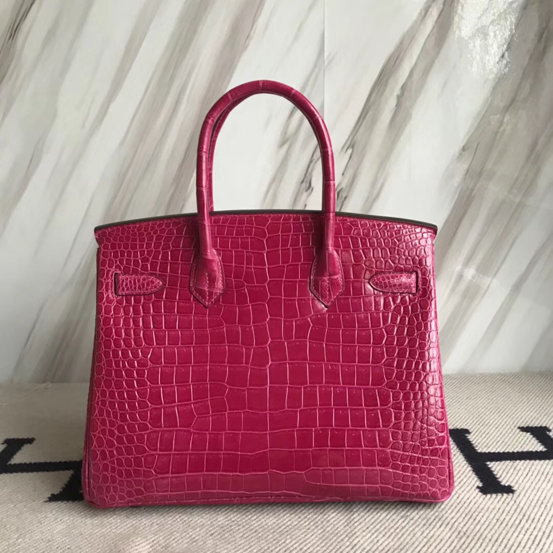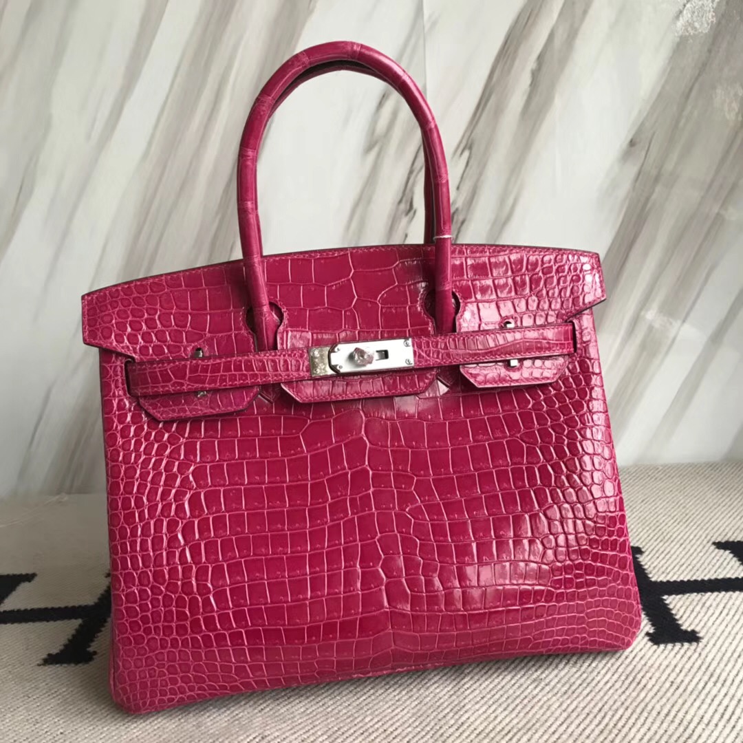 爱马仕鳄鱼皮铂金包价格 Hermes Birkin 30cm 5J桃红色 亮面倒V 野生湾鳄 御用原装HCP鳄鱼皮 全手工蜡线缝 银扣 完美品相 Shiny porosus crocodile