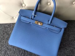 爱马仕包包官网 铂金包图片价格 Hermes Birkin 25cm 2T Blue Paradis 天堂蓝 御用原厂Togo小牛皮 金扣 手工蜜蜡线缝制 更多拼色可以定制