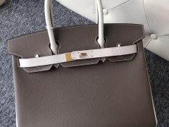 爱马仕铂金包尺寸多少 Hermes Birkin 25cm Epsom Hss M8沥青灰/CK10奶昔白 拉丝金扣 马蹄印 客定出货 全手工蜡线缝制