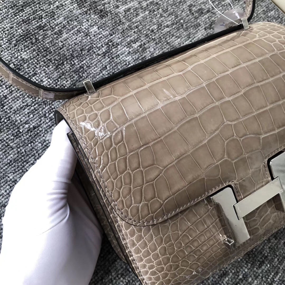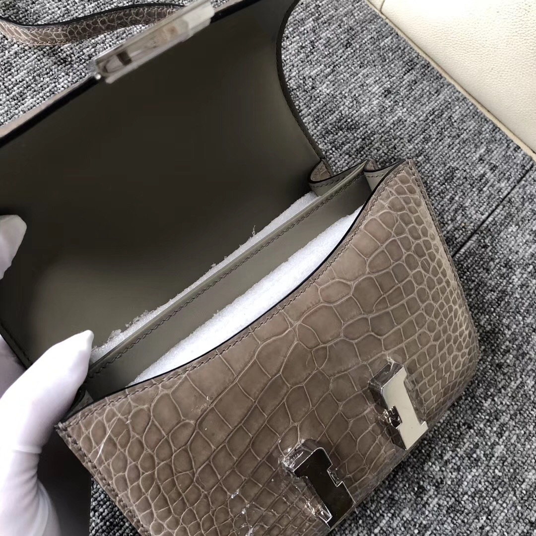 爱马仕空姐包排行榜 Hermes Constance 19cm CK81斑鸠灰 Gris Tourterelle 亮面方块 美洲鳄鱼 Shiny alligator crocodile 银扣 全手工蜡线缝制