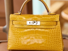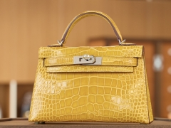 爱马仕 Mini Kelly II 迷你凯莉二代 亮面鳄鱼皮 琥珀黄银扣 Mini Kelly II