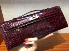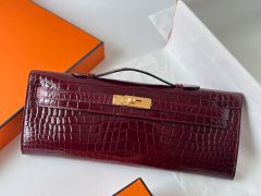 Hermes Kellycut 31cm 宴会手拿包 亮面倒V 野生湾鳄 F5勃艮第酒红 银扣