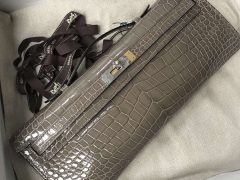 爱马仕凯莉手拿包晚宴包 Hermes Kellycut 31cm 锡器灰 亮面两点 尼罗鳄鱼 银扣