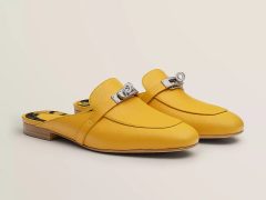 Hermes Oz 穆勒鞋 砂砾黄山羊皮 配 “盛大欢庆”图案印花棉质帆布