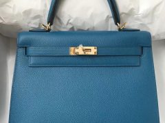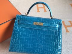 爱马仕凯莉包价格Hermes Kelly bag 32 亮面两点鳄鱼 7w伊兹密尔蓝金扣