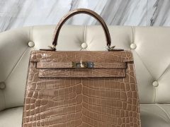 爱马仕凯莉包包 Hermes Kelly Bag 25cm 杏色 亮面两点 尼罗鳄鱼皮 金扣