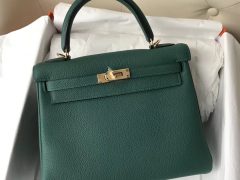 Hermes包包官网 Hermes Kelly 25 Bag Z6孔雀绿 金扣原厂Togo皮 全手工缝制