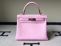 爱马仕包包倒V湾鳄凯莉包 Hermes kelly 28 Bag 5P樱花粉 雾面倒V湾鳄鳄鱼皮 银扣