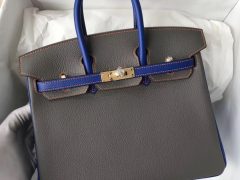 新加坡爱马仕专卖店Hermes Birkin 25 Togo 8F锡器灰/I7琉璃蓝 拉丝金扣 马蹄印