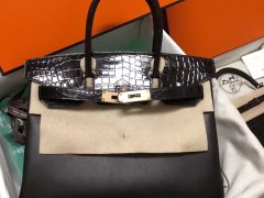 爱马仕铂金包价格 Hermes Birkin Bag 25 Swift 黑色 手腕拼亮面两点鳄鱼皮 玫瑰金