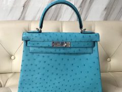 Hermes包包官网 爱马仕鸵鸟皮凯莉包Hermes 7F孔雀蓝Kelly 28南非鸵鸟皮金扣