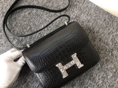 爱马仕空姐包 Hermes Constance 19cm CK89黑色 美洲鳄 配自然色蜥蜴扣