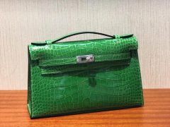 Hermes Mini Kelly pochette 亮面方块鳄鱼皮革 1L仙人掌绿 银扣