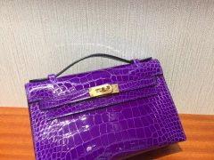 Hermes Mini Kelly 22cm pochette 亮面方块鳄鱼皮皮革 05L极度紫 金扣金属