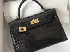爱马仕迷你凯莉包2代 Hermes mini Kelly二代 20亮面方块鳄鱼皮革CK89黑色金扣