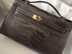 Hermes Mini Kelly 22cm pochette 爱马仕凯莉手拿包 亮面方块鳄鱼8P铅笔灰