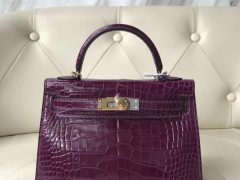 爱马仕Hermes 新款mini kelly二代 20cm 二代 N5加仑紫 亮面鳄鱼皮金扣