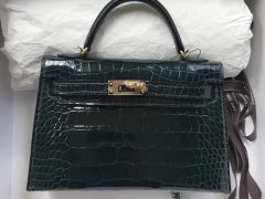 爱马仕Hermes mini Kelly 二代 19cm 亮面方块 美洲鳄鱼1P 鸭子蓝 金扣
