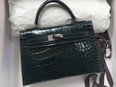 爱马仕C刻 minikelly 2代 爱马仕迷你凯莉包 亮面方块 美洲鳄鱼1P鸭子蓝 银扣