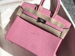 北京爱马仕铂金包价格 Hermes Birkin 25cm 雾面倒V湾鳄 5P bubblegum pink 樱花粉