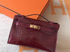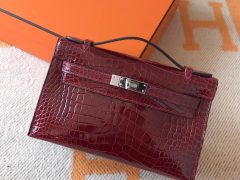 爱马仕凯莉包 Hermes Mini Kelly 22 pochette 手拿包 亮面方块鳄鱼 F5 勃艮第酒红金扣