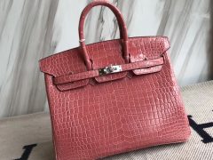 爱马仕包包官网价格 Hermes 龙虾粉 Birkin 25cm 亮面倒V澳洲湾鳄鱼 银扣