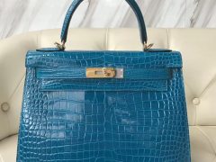 爱马仕凯莉女包 Hermes Kelly 28cm 7W伊兹密尔蓝 亮面倒V 野生湾鳄 金扣