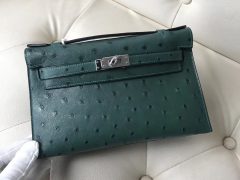 Hermes Z6孔雀绿 MiniKelly 22cm pochette 手拿包 南非鸵鸟皮 银扣