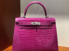 爱马仕凯莉包 Hermes J5天方夜谭粉紫 Kelly 28cm亮面倒V 野生湾鳄银扣